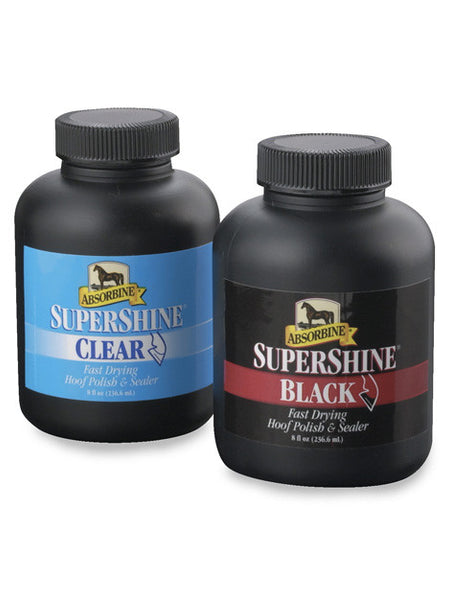 SuperShineHoof Polish dries quickly and leaves hooves with a magnificent mirror-like finish. The product does not penetrate beyond the surface of the hoof wall, so it will not harm the hoof. SuperShine rubs off in a week with the horse's normal activities in the stall, paddock, or pasture.