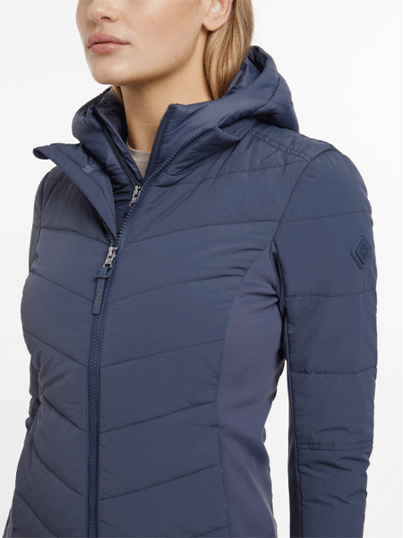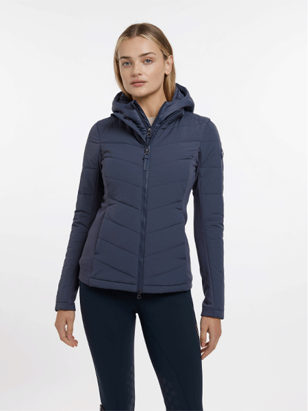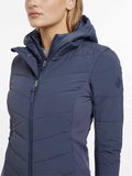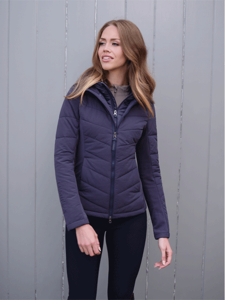 This is a very versatile jacket which is beautifully styled, so you don't need to save it for the yard. The durable, water-repellent crepe shell features a detachable insulated chest and hood panel and soft-touch brushed jersey side and underarm panels, giving you flexible warmth alongside freedom of movement. The lightweight, insulated baffle chest and hood panel zips out from the jacket shell, giving you flexible insulation options depending on the weather. Wear both parts together for extra warmth, or wear the jacket alone as weather conditions demand. There are popper loops to secure the hood at the neck, and a two-way central zip to protect your saddle from scratches.