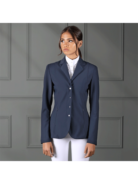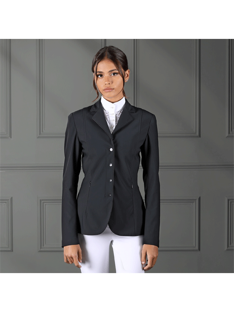 Elegant show jacket which has a slim, contour active cut and a minimalistic style and is made using a stretch material. Satin is piped around the jacket edge for definition, cuffs are zipped for an immaculate silhouette.