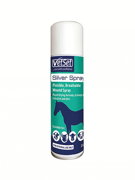 VetSet Silver Spray is a spray-on antiseptic producing a breathable and flexible aluminium film for abrasions, cuts, grazes and wounds.