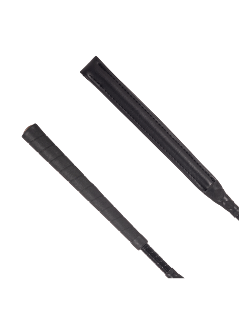 Compact and lightweight whip ideal for competition riding and training. This whip features a  competition grip rubber handle, with a cushioned bat end and stylish patent leather spiral detail. It is suitable for competition use or everyday riding.