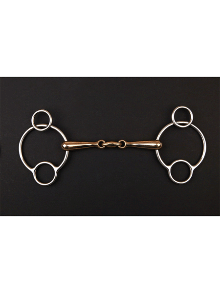 This type of bit is similar to a snaffle that exerts pressure on the poll, which can aid control of strong horses and encourage them to lower their head. The cheek pieces are attached to the ring at the top. The reins can be attached to either the large ring, for the least amount of poll pressure, or the smaller ring underneath, which increases the poll pressure.