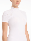 The Olivia Show Shirt is adorned with intricate, laser-cut lace sleeves and back detail, adding a feminine touch that empowers you and allows for optimal airflow to regulate heat and moisture. An invisible front zip closure keeps the shirt sleek. The shirt is elegantly finished with a white show collar featuring a LeMieux stud.