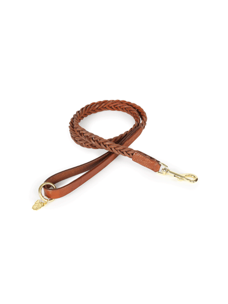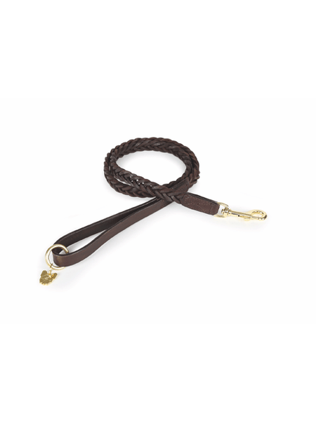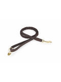 Plaited leather for distinctive style with an elegant twist. This beautifully finished leather dog lead features a swivel trigger clip to stop the lead becoming twisted. Flat leather handle, brass buckle and D-ring, Digby & Fox tag. Length: 110cm.  Matching collar available.