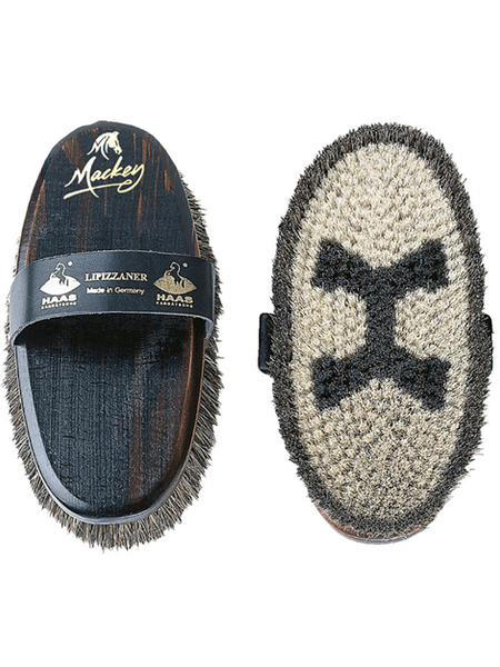An ideal brush for grey horses with an exclusive horse hair mixture. The border is edged with longer black horse hair.. The shorter bristles for gentle cleaning and the longer for removing dust and giving gloss.