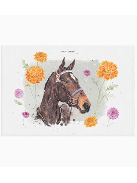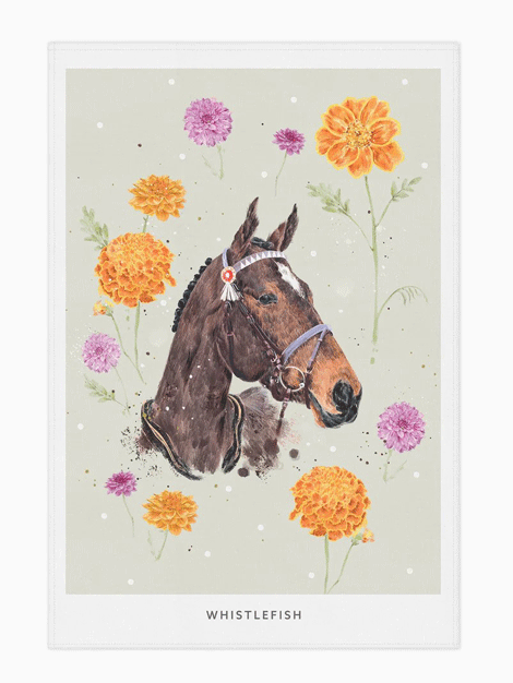 Enhance your kitchen with this elegant tea towel, showcasing a proud horse amidst a floral backdrop of marigolds and soft blooms. A lovely addition to any home, it combines functionality with a touch of countryside charm. Part of the Grace and Gallop collection.