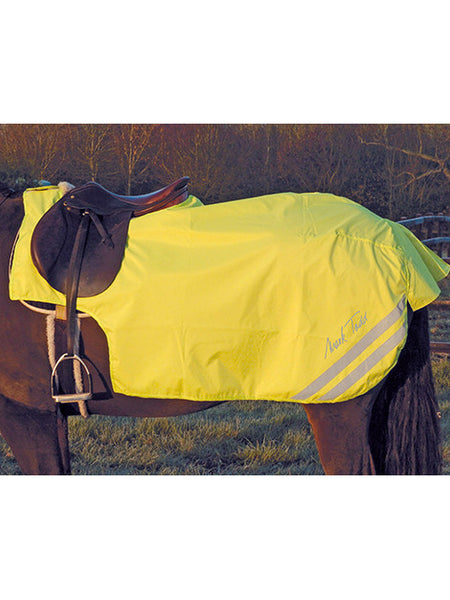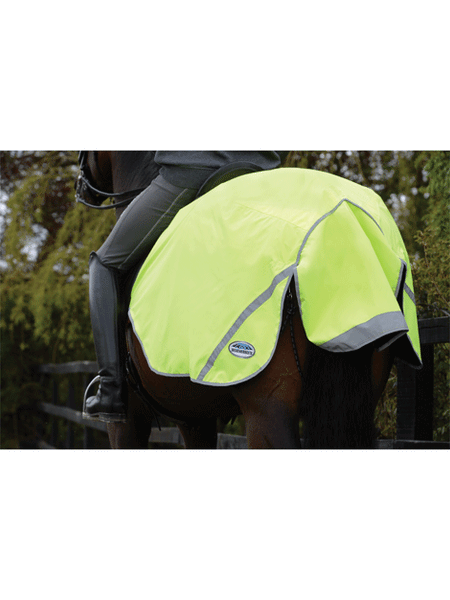 Outer waterproof and breathable, 600D polyester. Inner fleece liner. Hook and loop wither attachment, filet string, large tail flap. Cut away area to accommodate rider's leg, twin reflective strips.