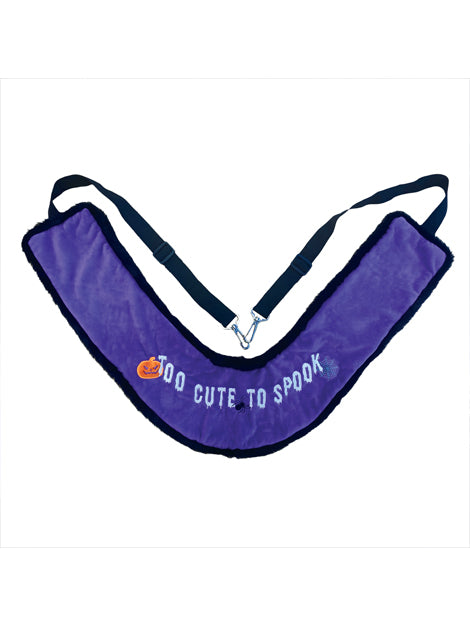A super novelty plush purple and white breastplate from Equetech with 'Too Cute to Spook' Halloween embroidery.