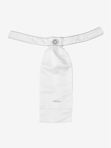 Made in soft breathable satin fabric with a ruched front and embroidered trim, finished with a fixed decorative beaded stock pin.