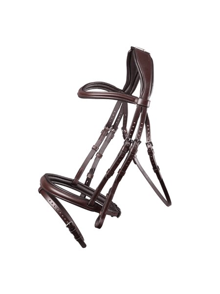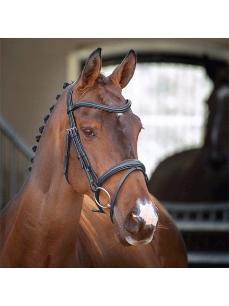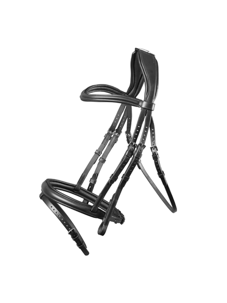 The ergonomic fit pressure alleviating deeper noseband tapers to the sides and has an appealing domed profile. Deep cushioned leather padding on the underside of the nose, brow and head adds further relief. A graceful curved shape to the browband adds refinement.
