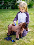 The ‘clipped’ look is achieved through pile reversal in Gracie's coat, which mimics natural horsehair. Pile-reversing play clippers, grooming brush, stencils and genuine skills instructions for authentic clip, plait and quarter mark styles are included.